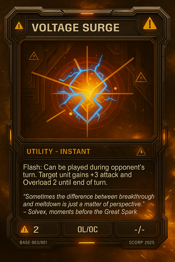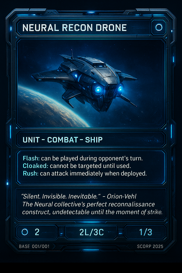 Cards like Ironscale Warrior, Voltage Surge, and the Neural Recon Drone represent our current polished style. These combine faction immersion with clean mechanics, making every card both beautiful and practical in live play.